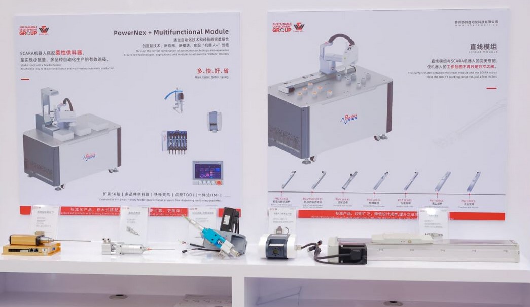 本次展會帶去的PowerNex SCARA機器人,搭配柔性供料器及視覺系統,同時配有模組及輸送定位模組。模擬3C、新能源、汽車、醫療等行業的搬運、裝配、視覺監測、取放料等工藝。本次機臺著重展示了在多種物料混料的情況下,視覺系統仍能根據特徵識別,自行分類配裝。為配裝制程中,自我調整配裝的難點提供了實際可行的解決方案。更多產品資訊可參考網頁(LINK)。